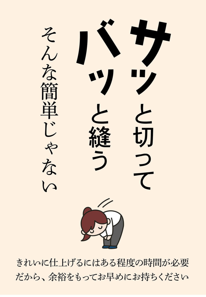 お直しには時間がかかるものあるから「早めに持ってきてね」。